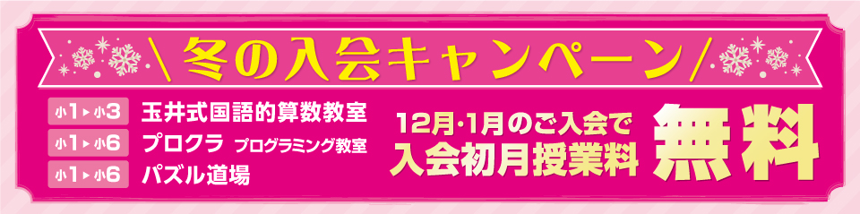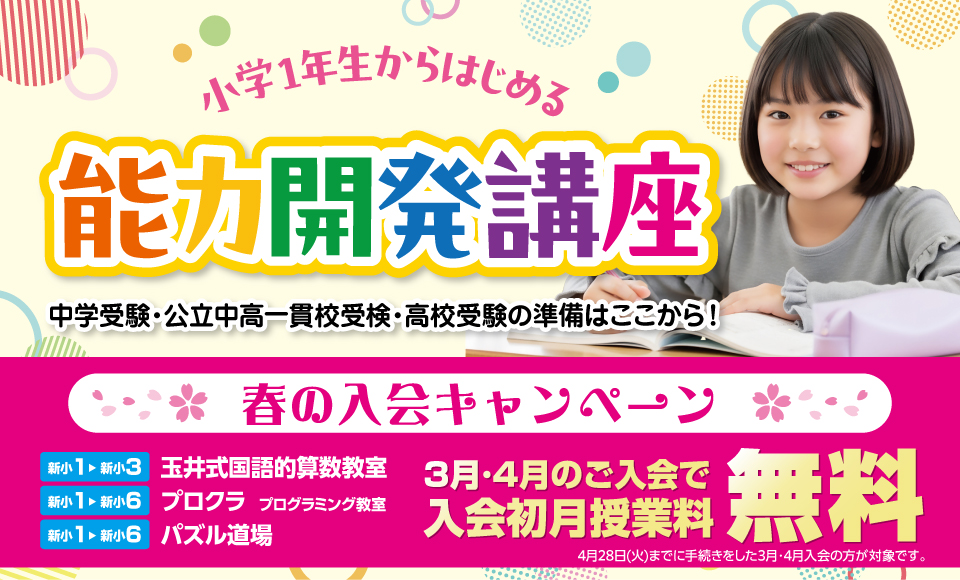 「パズル道場」「玉井式国語的算数教室」「プログラミング教室プロクラ」は、子どもたちの将来を見据えて“本当に必要とされる能力”を伸ばすためのプログラムです。難関中学・公立中高一貫校・高校・大学受験に対応できる、柔軟な思考力や豊かな表現力、その先も伸び続ける学力の土台を育成します。