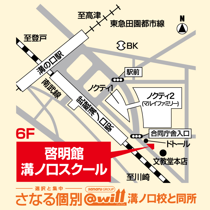 啓明館溝ノ口スクールの校舎はJR南武線「武蔵溝ノ口駅」・東急田園都市線「溝の口駅」から徒歩3分の好立地。さなる個別@will 溝ノ口校 と同じ敷地内ですので、個別指導との連携もスムーズです。