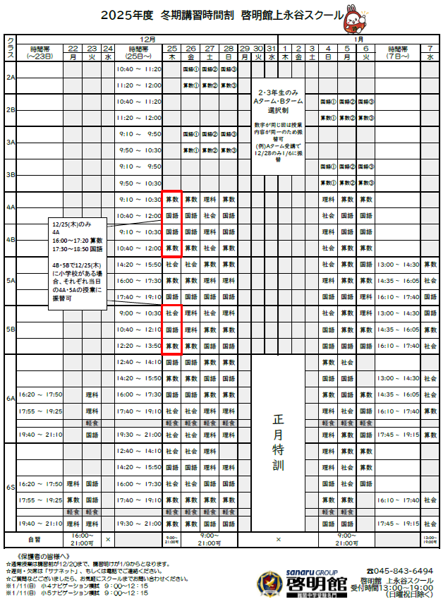 【小2】・日程[A日程]2025年 12/26(金)・12/27(土)・12/28(日)[B日程]2026年 1/4(日)・1/5(月)・1/6(火)●A日程とB日程は同一内容です。ご都合の良い日程をお選びください。・教科 算数40分×3回、国語40分×3回・受講料 8,250円(税込・教材費込)●講習開始前日までに入学手続きをされた方は、早期入学特典料金 6,050円(税込・教材費込)【小3】・日程[A日程]2025年 12/26(金)・12/27(土)・12/28(日)[B日程]2026年 1/4(日)・1/5(月)・1/6(火)●A日程とB日程は同一内容です。ご都合の良い日程をお選びください。・教科 算数40分×3回、国語40分×3回・受講料 8,250円(税込・教材費込)●講習開始前日までに入学手続きをされた方は、早期入学特典料金 6,050円(税込・教材費込)【小4】・日程2025年 12/25(木)・12/26(金)・12/27(土)・12/28(日)、2026年 1/4(日)・1/5(月)・1/6(火)の7日間・教科 算数80分×5回、国語80分×5回、理科80分×2回、社会80分×2回・受講料 28,600円(税込・教材費込)●講習開始前日までに入学手続きをされた方は、早期入学特典料金 23,100円(税込・教材費込)【小5】・日程2025年 12/25(木)・12/26(金)・12/27(土)・12/28(日)、2026年 1/4(日)・1/5(月)・1/6(火)・1/7(水)の8日間・教科 算数90分×8回、国語90分×8回、理科90分×4回、社会90分×4回・受講料 46,310円(税込・教材費込)●講習開始前日までに入学手続きをされた方は、早期入学特典料金 40,810円(税込・教材費込)- 小1~小6対象 パズル道場実施中! NEW