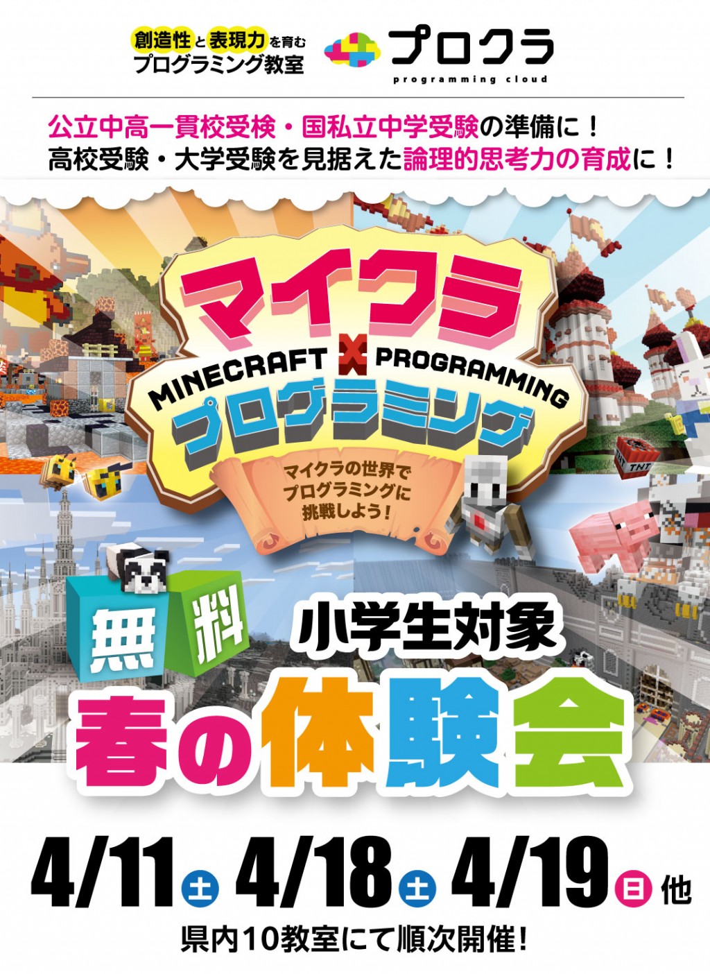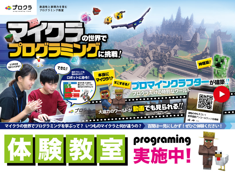 「プロクラ」は、小学生に人気の「マインクラフト」の世界で取り組むプログラミング教室です。